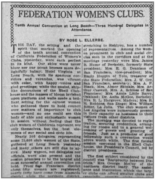 The principal gatherings were through Women’s Clubs. As varied as the women themselves; farming, sewing, teaching, arts, etc. Hundreds of women’s clubs formed, and their umbrella association was the California Federation of Women’s Clubs.